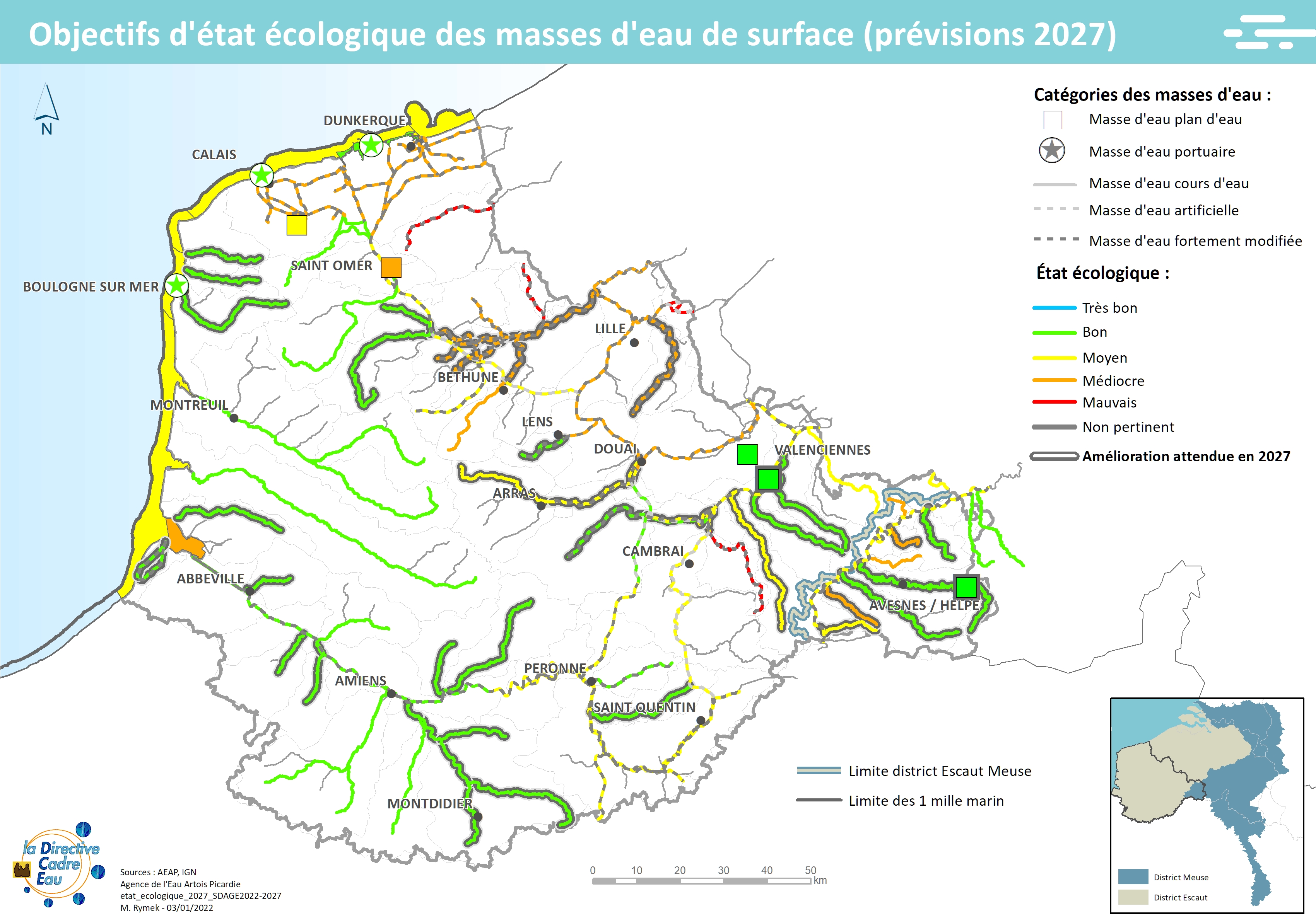Cette carte issue du SDAGE 2022-2027 présente les objectifs d'état écologique des masses d'eau de surface à l'horizon 2027.