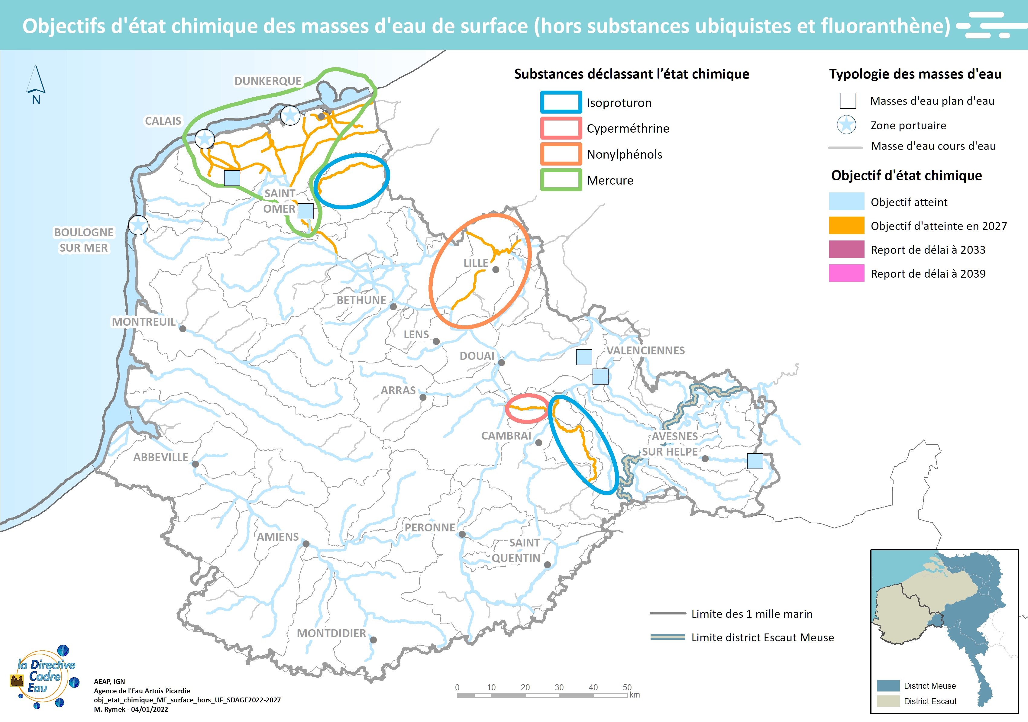 Cette carte est issue du SDAGE 2022-2027 (carte 10 du livret 4). Elle présente les objectifs d'atteinte de l'état chimique des masses d'eau de surface. Elle précise la localisation où les substances déclassant l'état chimique sont identifiées.