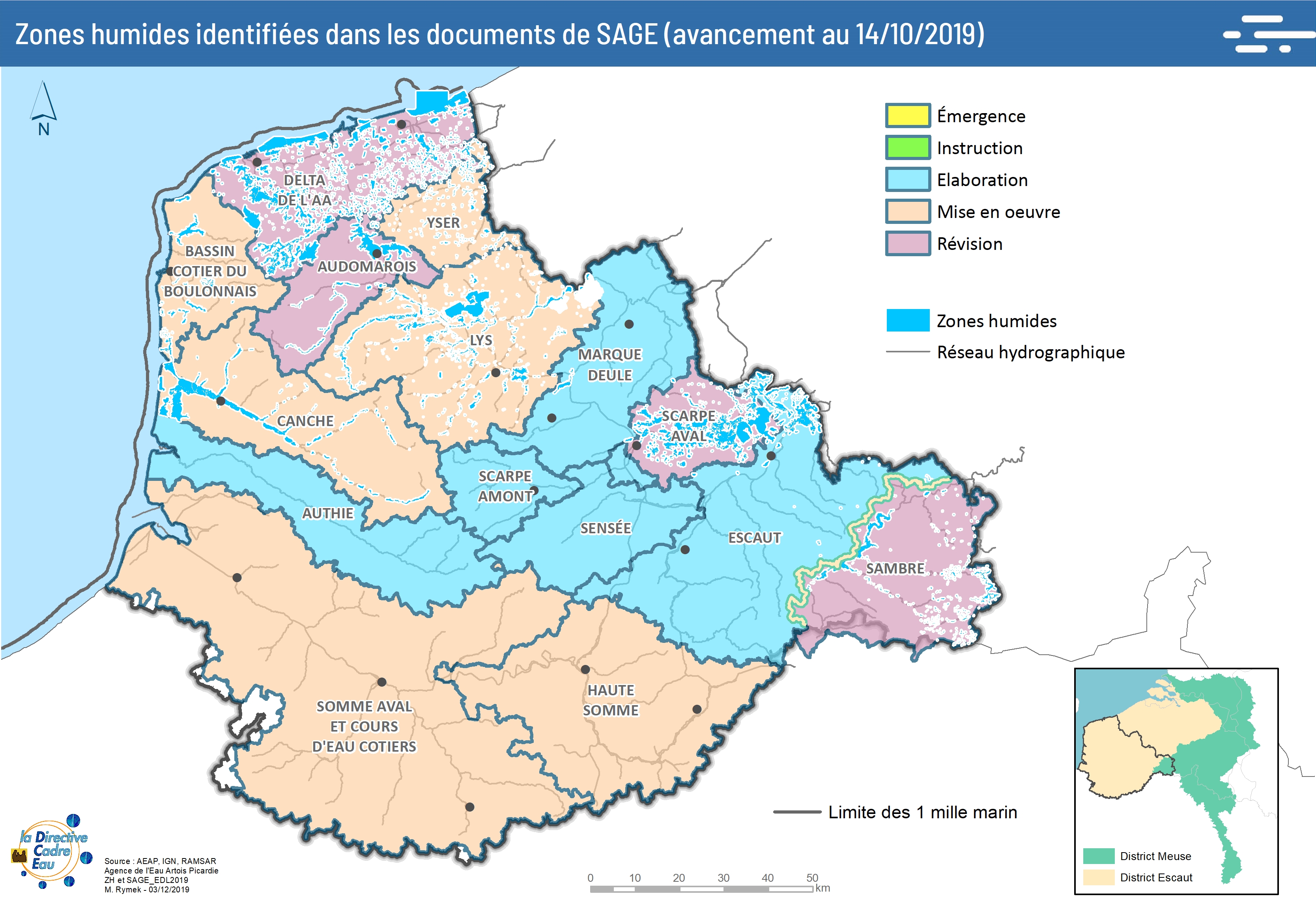 Cette carte issue de "l’état des lieux 2019" présente les zones humides identifiées dans les documents de SAGE ainsi que l’état d’avancement des SAGE (Schéma d’aménagement et de gestion des eaux).