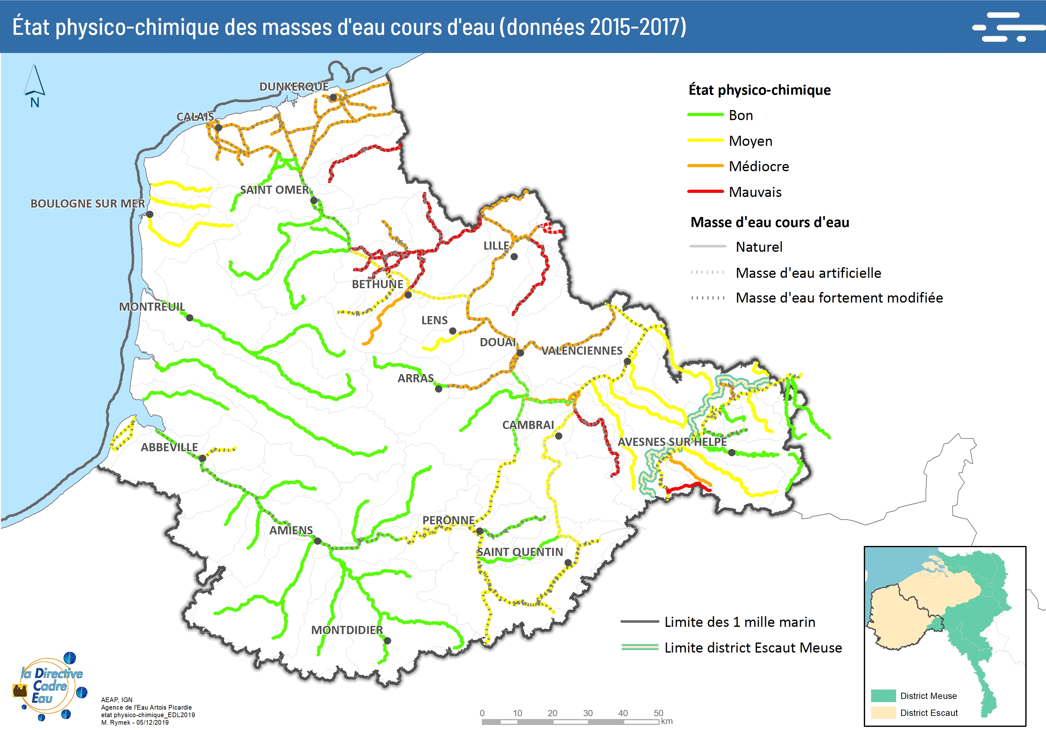 Cette carte issue de "l’état des lieux 2019" présente l’état physico-chimique des masses d’eau cours d’eau (données 2015-2017).