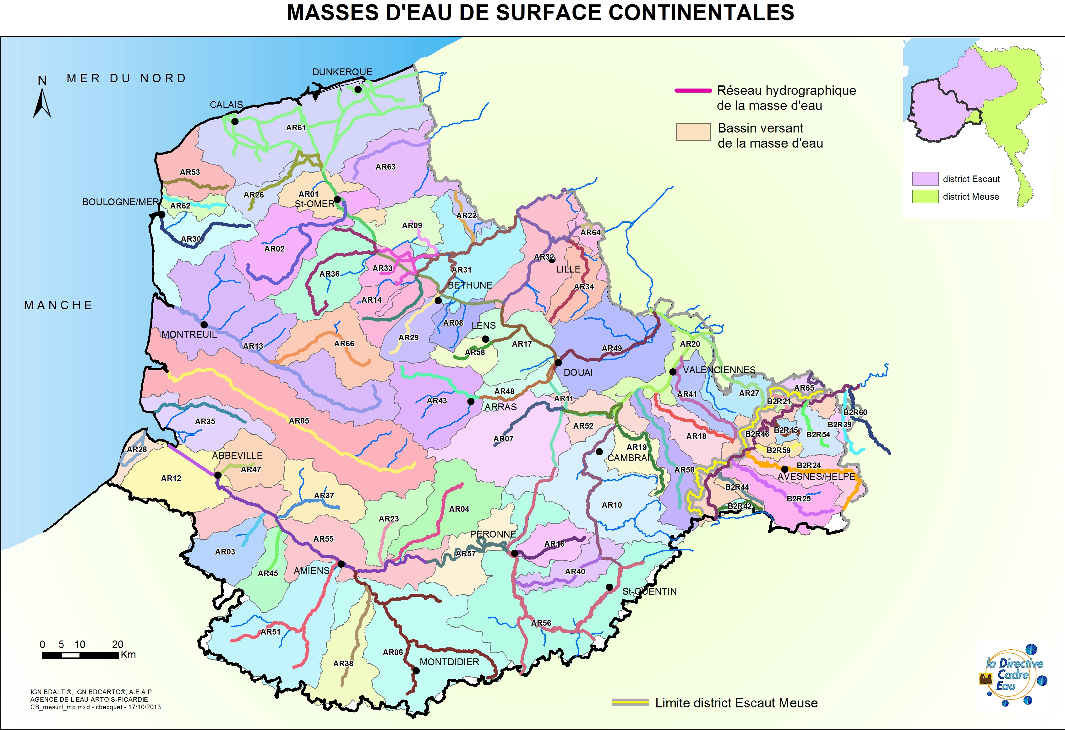La Directive cadre sur l'eau nous donne des objectifs d'atteinte du bon état des masses d'eau. Cette carte présente la délimitation des masses d'eau de surface continentales (rivières) définies pour le bassin, avec la délimitation de leur bassin versant.