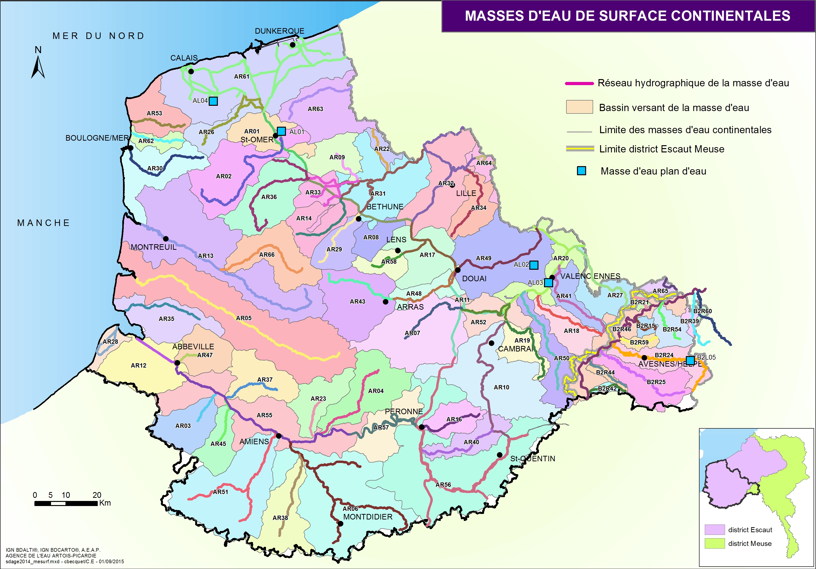 Le Schéma Directeur d'Aménagement et de Gestion des Eaux (SDAGE) fixe les objectifs d'atteinte du bon état des milieux aquatiques et les orientations pour atteindre ces objectifs. Cette carte issue du SDAGE 2016-2021 présente les masses de surface continentales de type rivières (cours d'eau) définies dans le cadre de la Directive cadre sur l'eau, ainsi que leurs bassins versants.