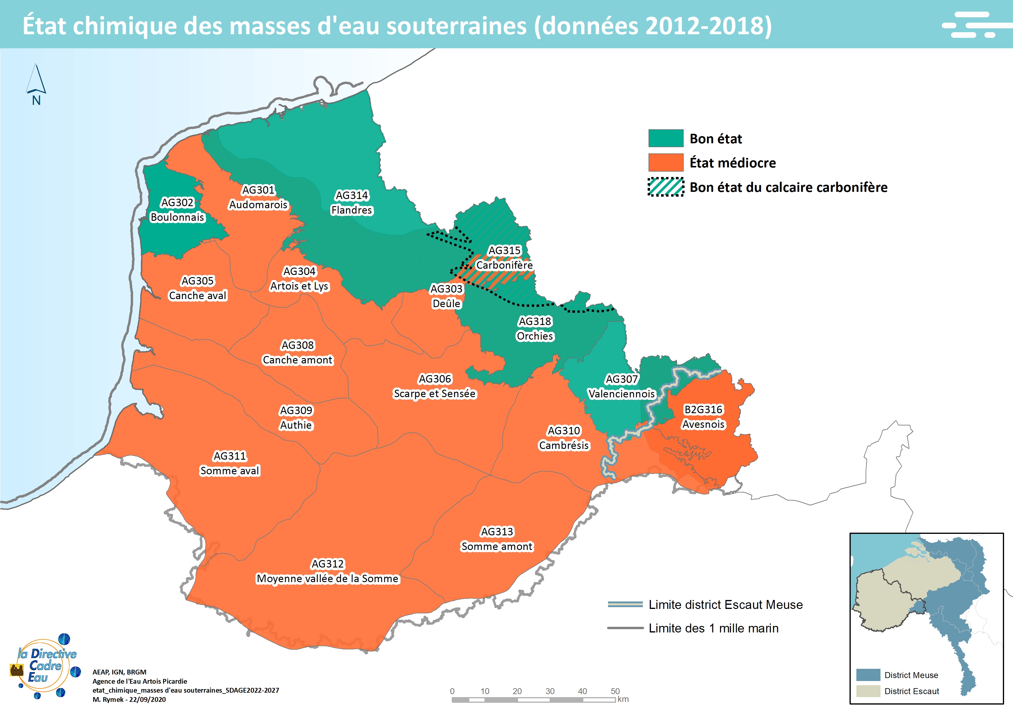 Cette carte issue du SDAGE 2022-2027 présente l'état chimique des masses d'eau souterraines (données 2012-2018)