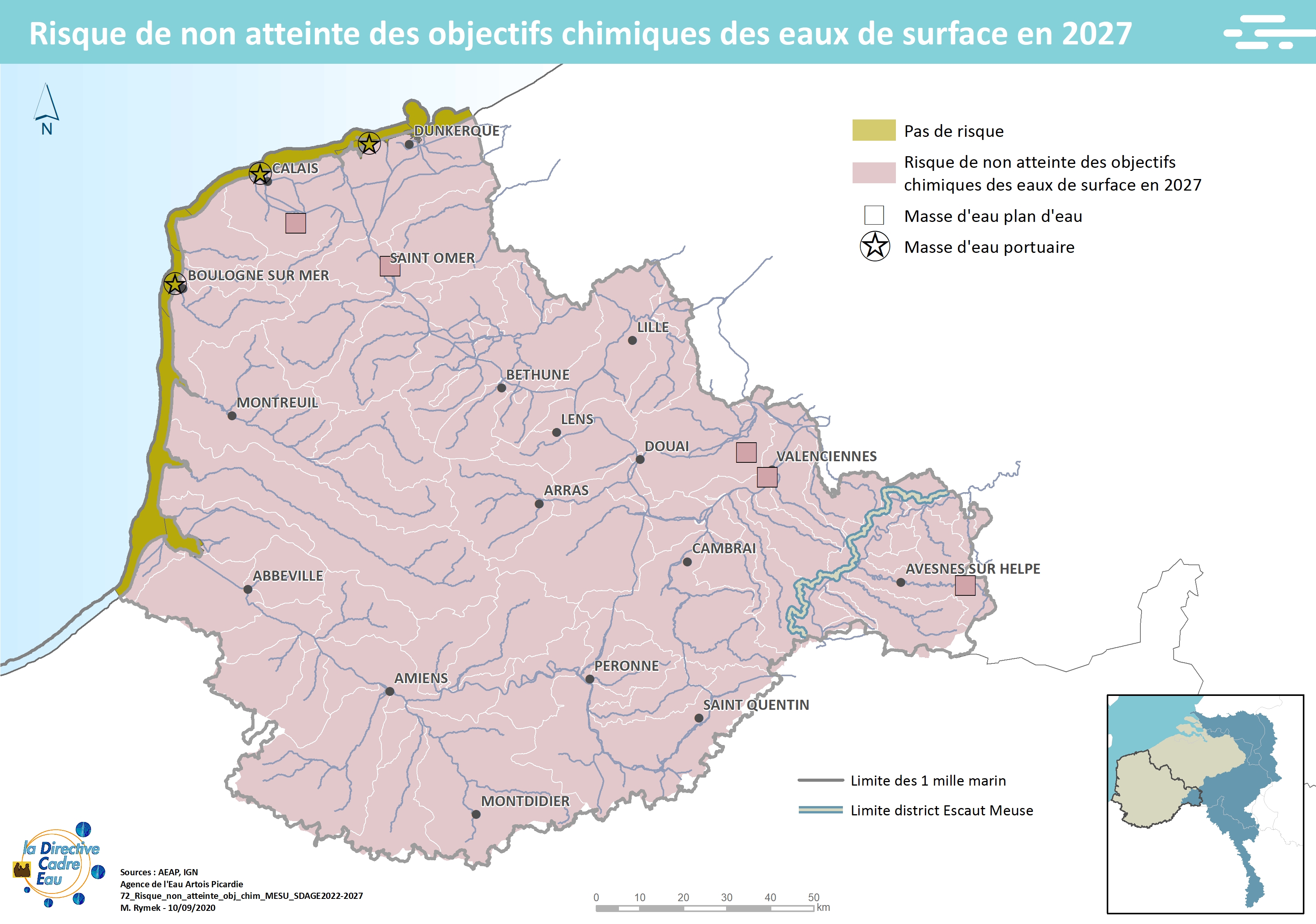 Cette carte issue du SDAGE 2022-2027 présente le risque de non atteinte des objectifs chimiques des eaux de surface en 2027