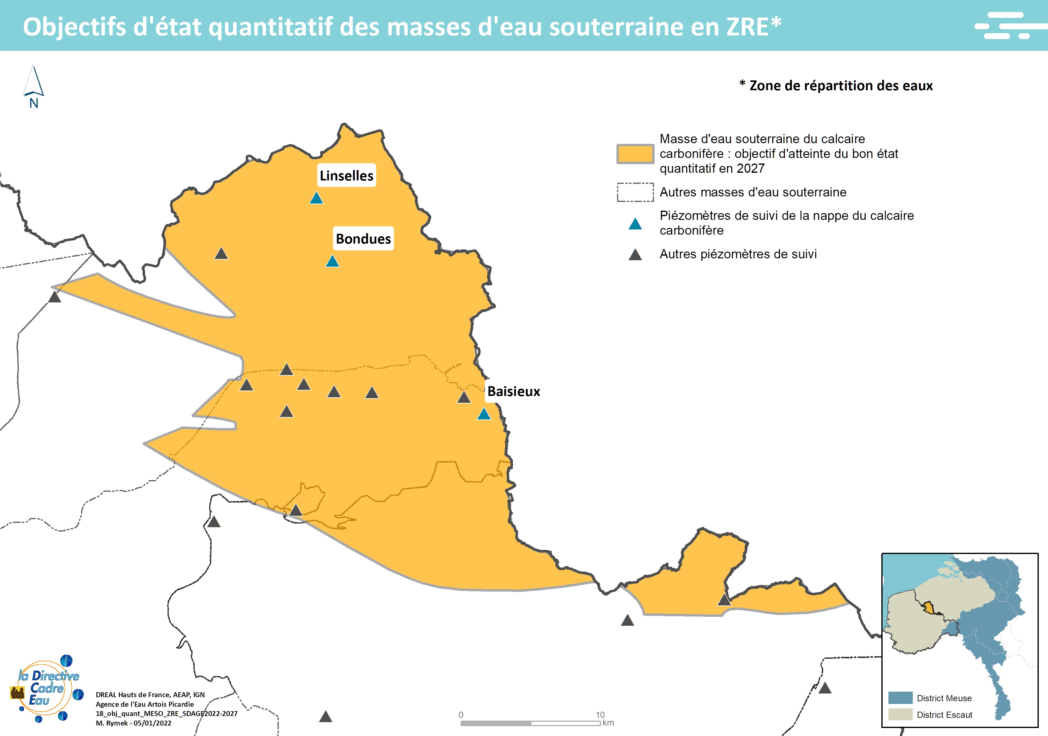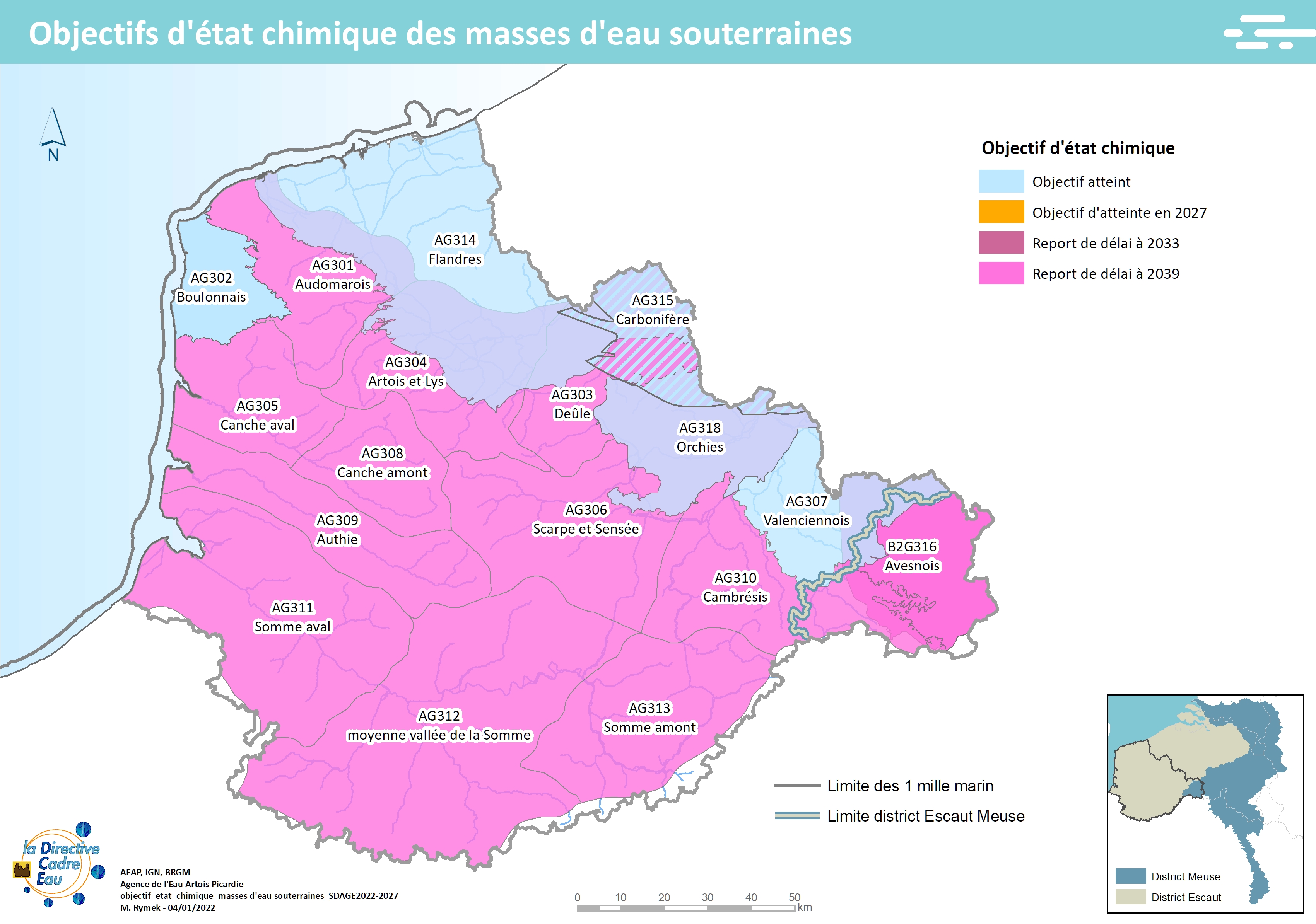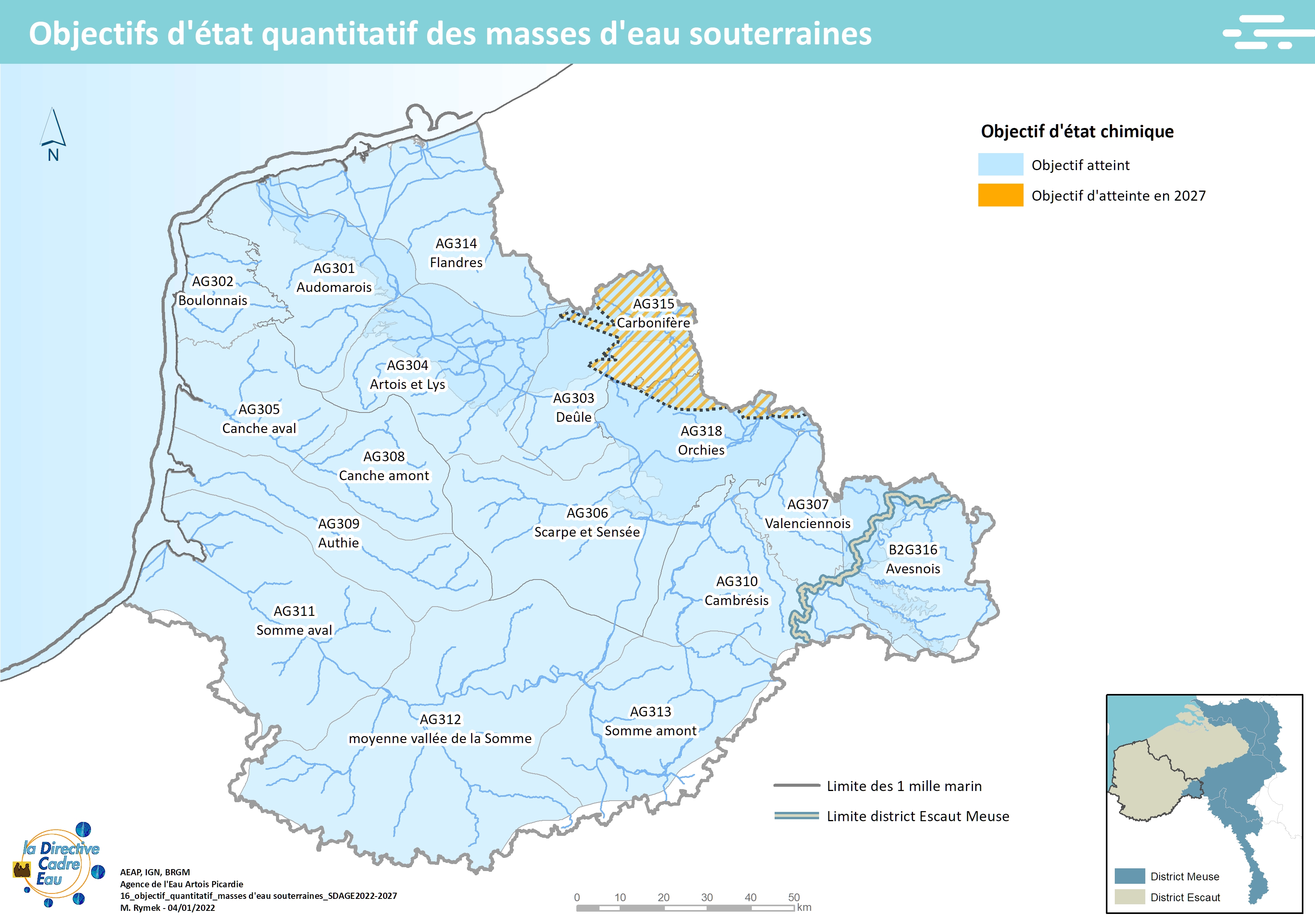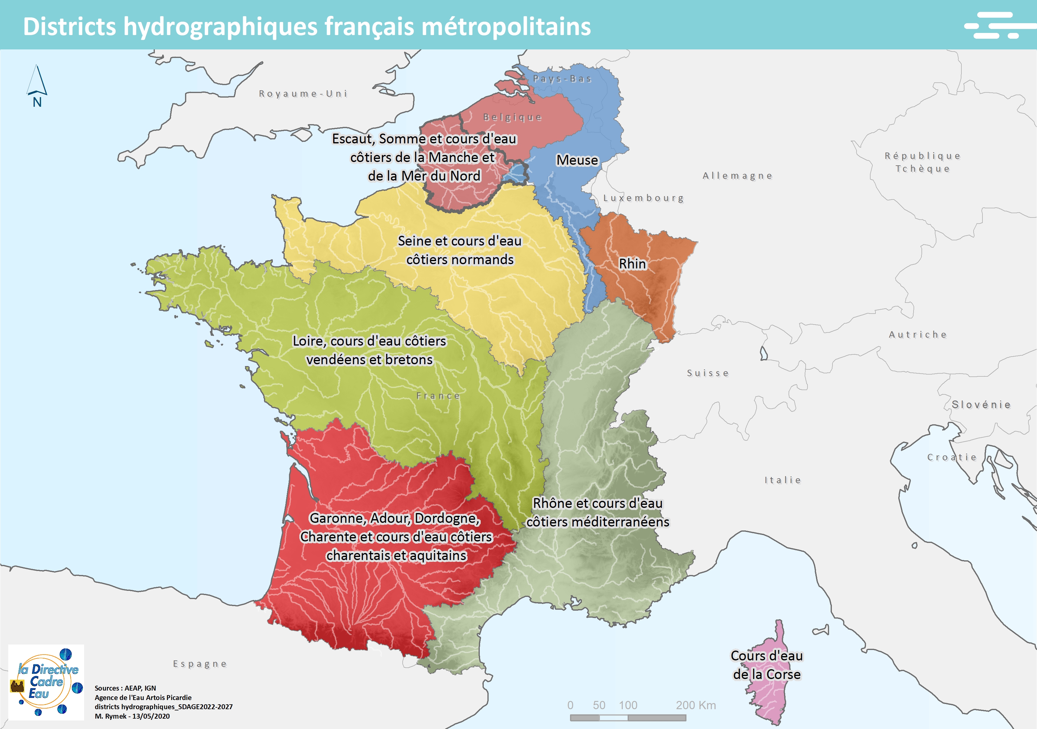 Cette carte issue du SDAGE 2022-2027 présente les districts hydrographiques européens du bassin Artois-Picardie