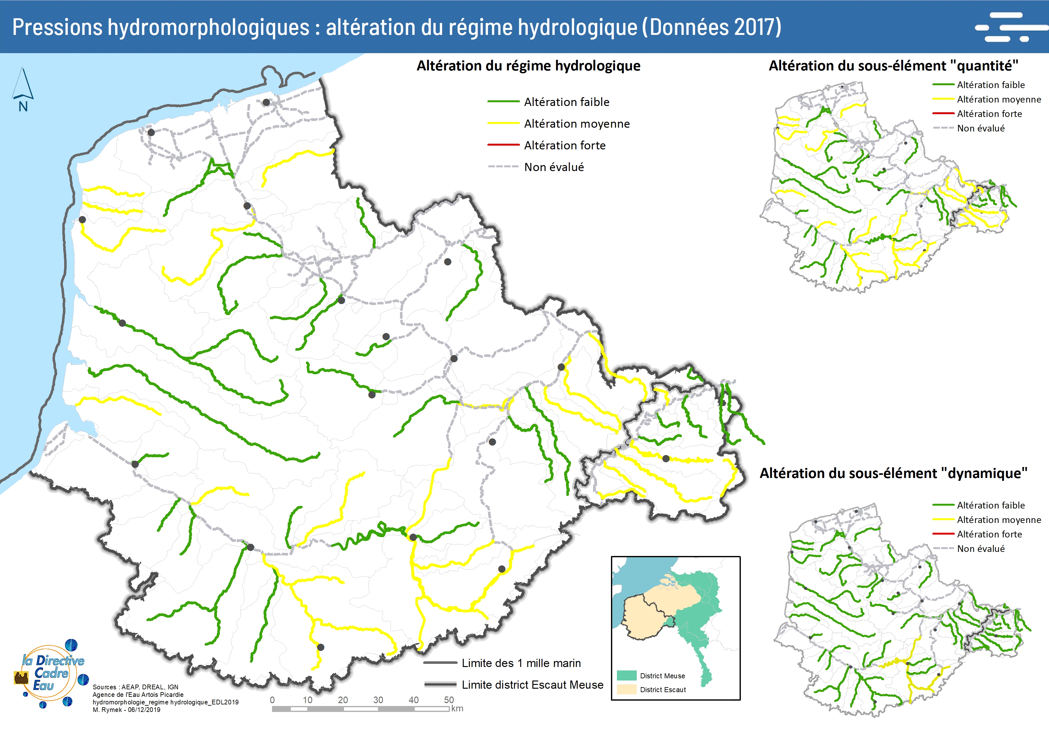 Cette carte issue de "l’état des lieux 2019" présente les pressions hydromorphologiques et plus précisément l’altération du régime hydrologique (débit, dynamique, connexion aux masses d’eau souterraines).