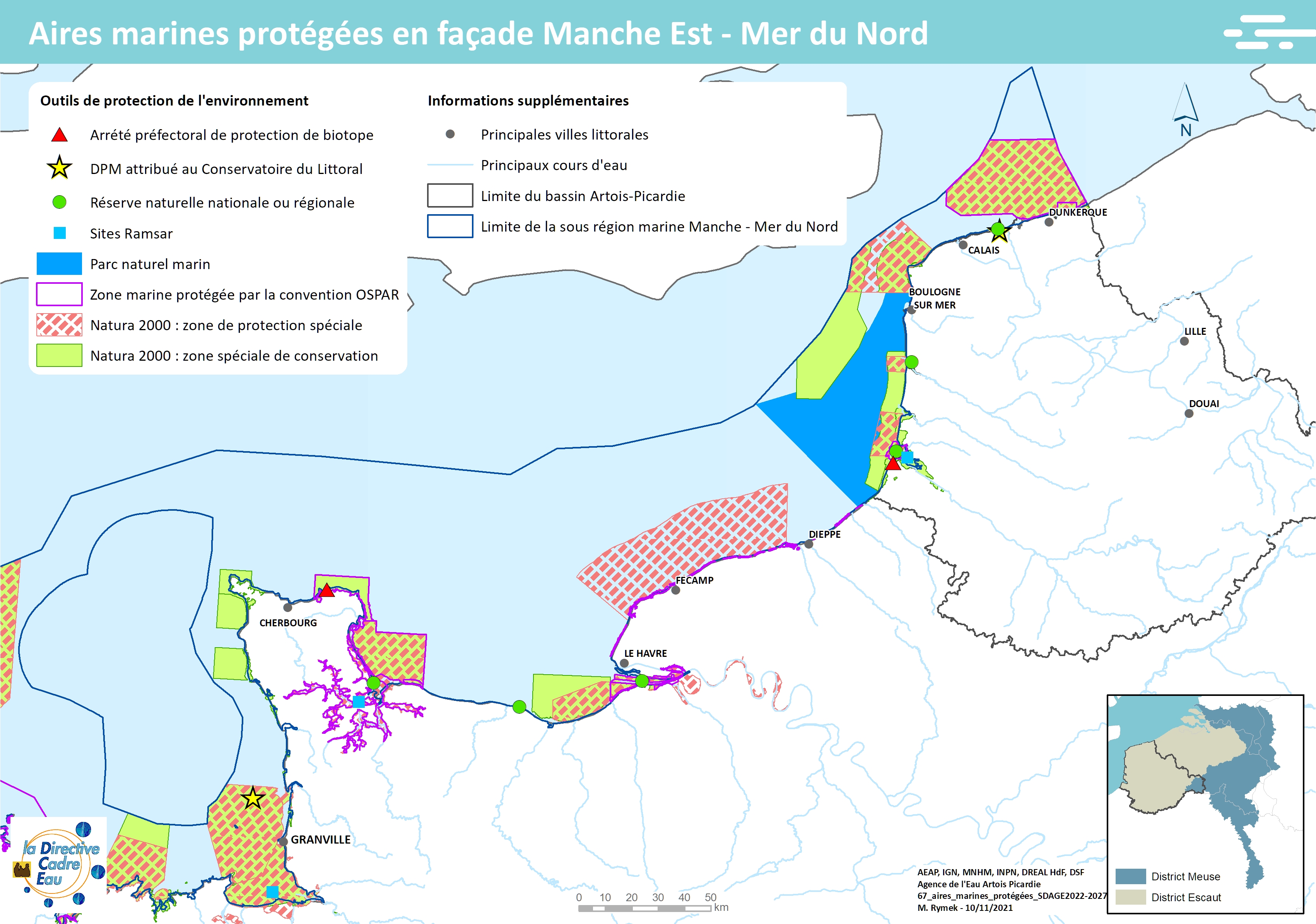 Cette carte issue du SDAGE 2022-2027 présente les Aires marines protégées en façade Manche Est - Mer du Nord