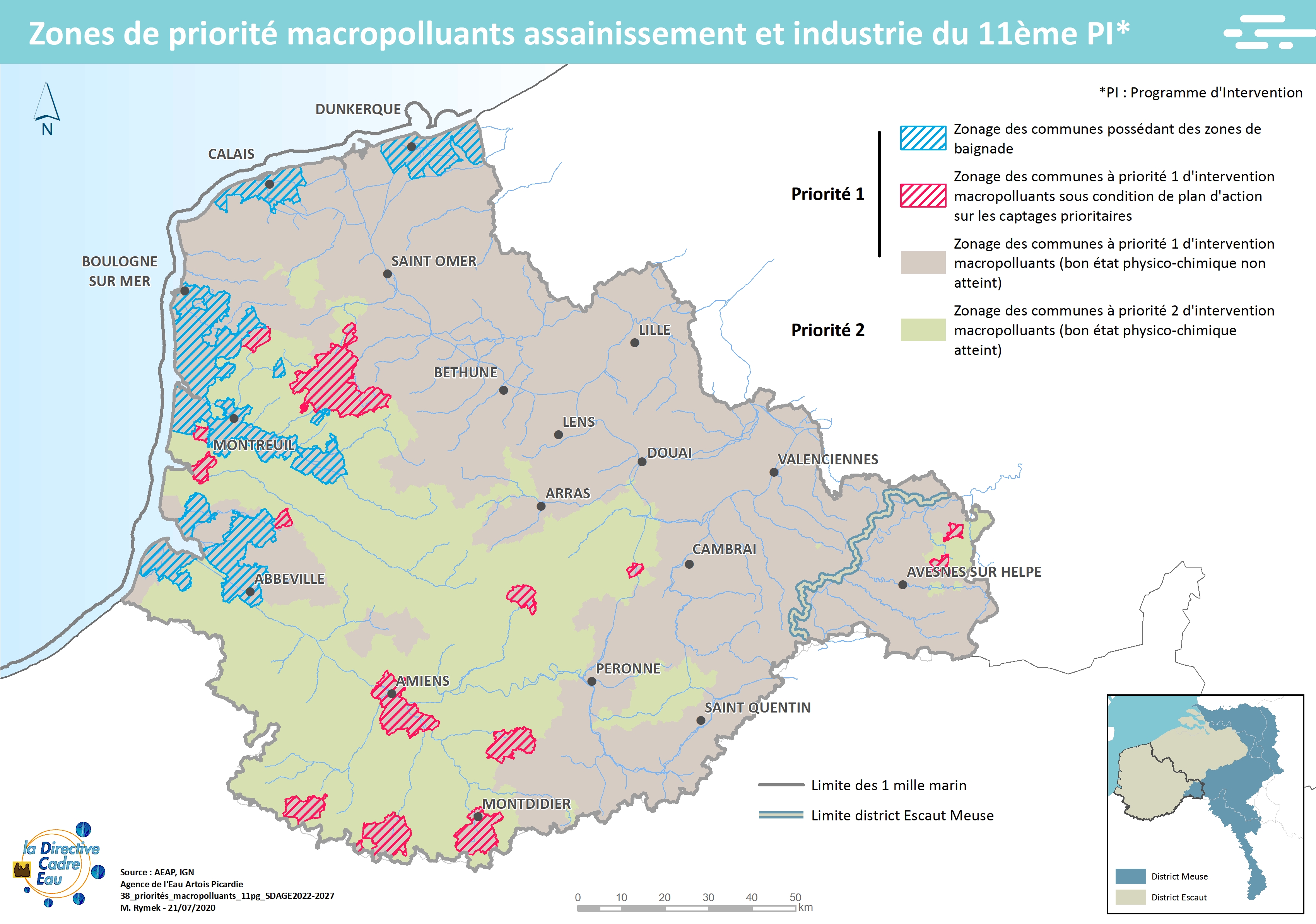 Cette carte issue du SDAGE 2022-2027 présente les zones de priorité macropolluants assainissement et industrie du 11ème Programme d'intervention