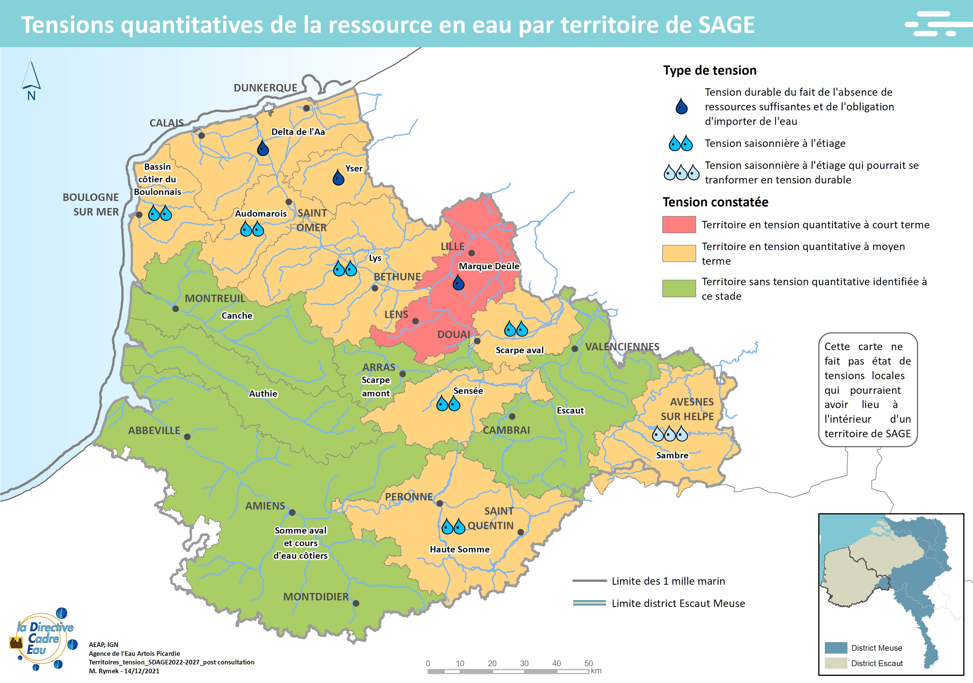 Cette carte issue du SDAGE 2022-2027 présente les tensions quantitatives de la ressource en eau par territoire de SAGE.