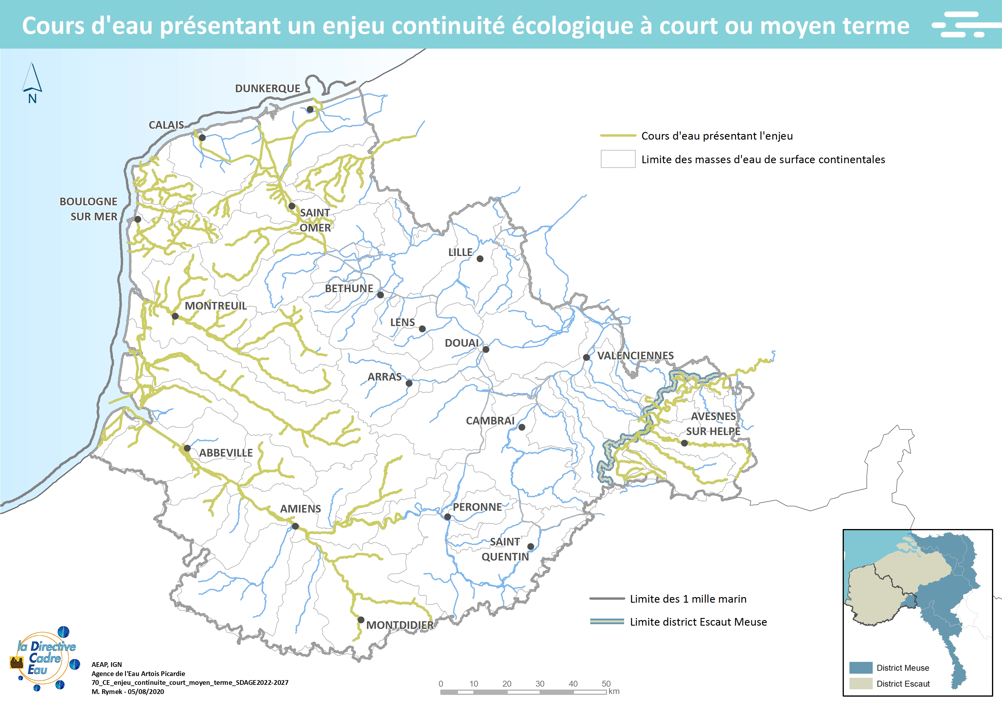 Cette carte issue du SDAGE 2022-2027 présente les cours d'eau présentant un enjeu continuité écologique à court ou moyen terme