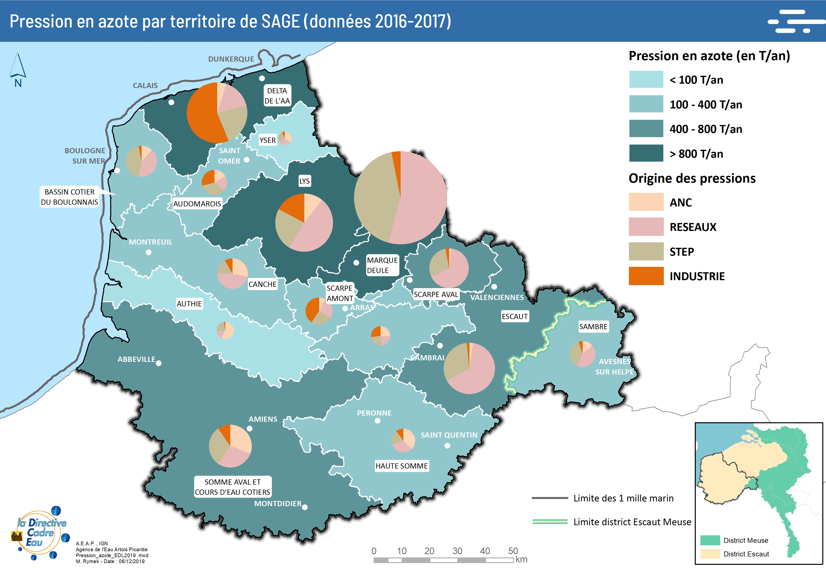 Cette carte issue de "l’état des lieux 2019" présente la pression en azote (en T/an) par territoire de SAGE ainsi que l’origine des pressions.
