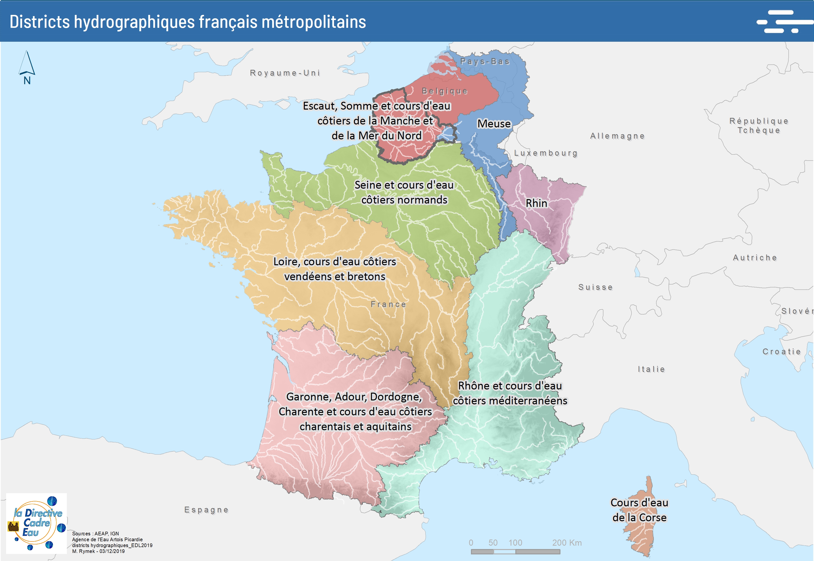 Cette carte issue de "l’état des lieux 2019" présente les 2 districts hydrographiques internationaux situés sur le bassin Artois-Picardie.