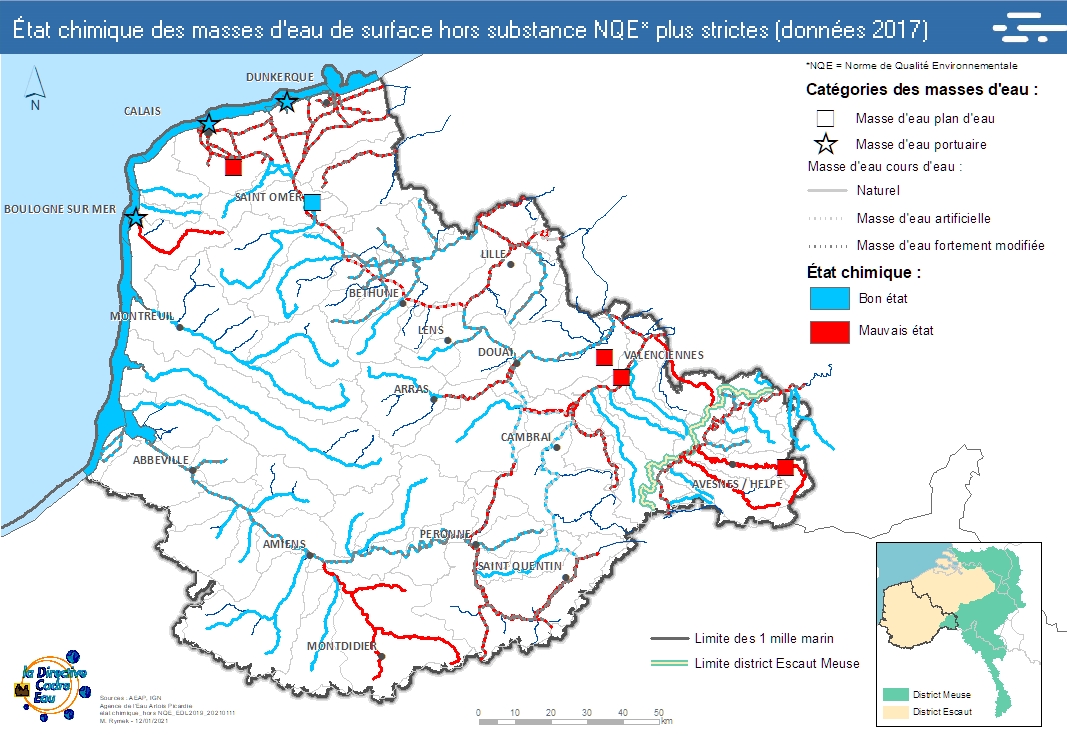 Cette carte issue de "l’état des lieux 2019" présente l’état chimique des masses d’eau de surface hors substance NQE (Norme de Qualité Environnementale)