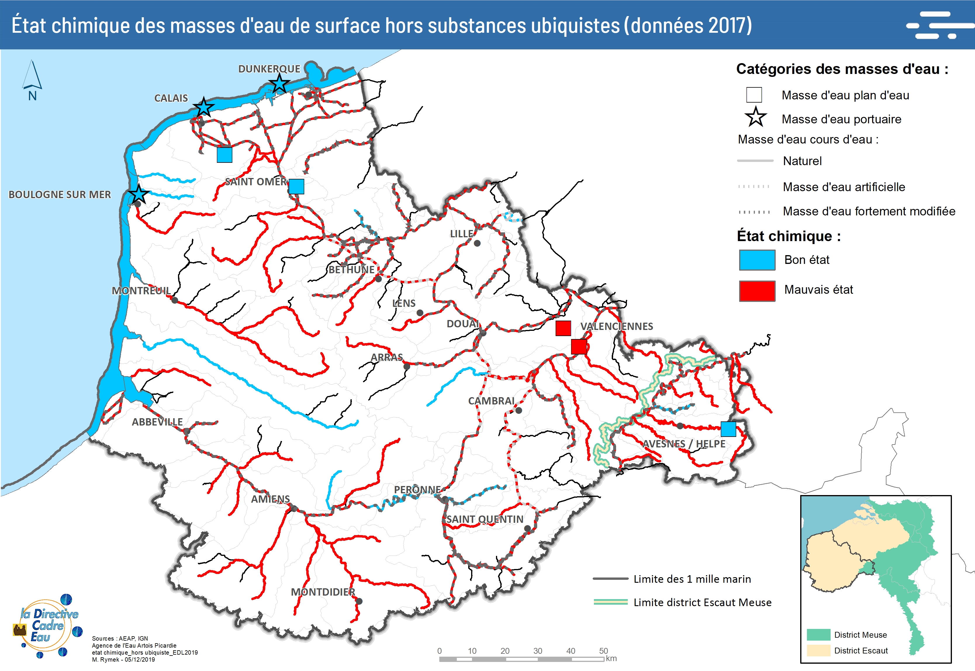 Cette carte issue de "l’état des lieux 2019" présente l’état chimique des masses d’eau de surface hors ubiquiste.