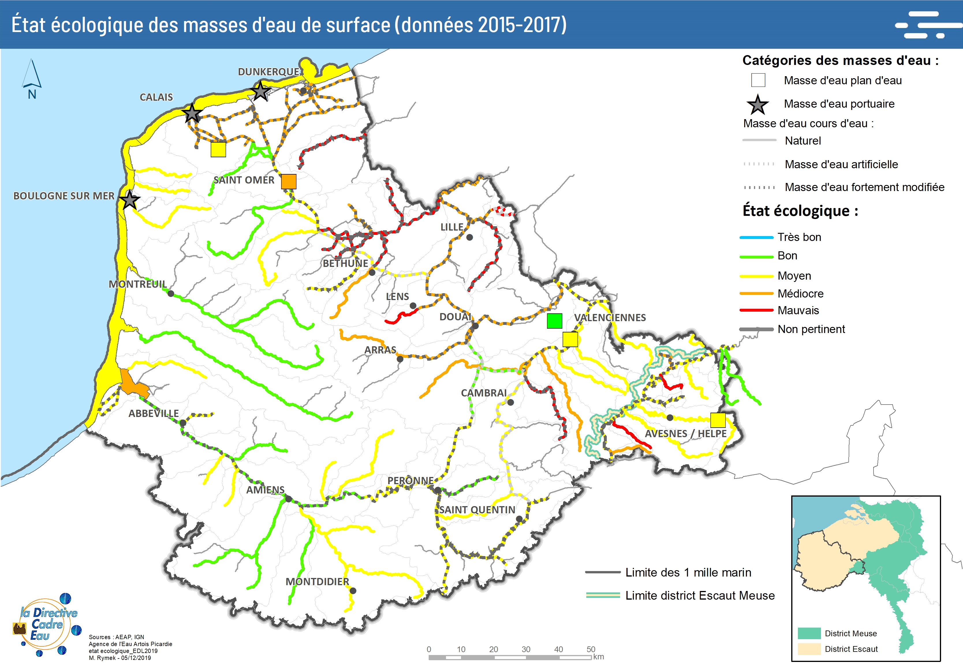 Cette carte issue de "l’état des lieux 2019" présente l’état écologique des masses d’eau de surface. L’état écologique est l’appréciation de la structure et du fonctionnement des écosystèmes aquatiques associés aux eaux de surface.