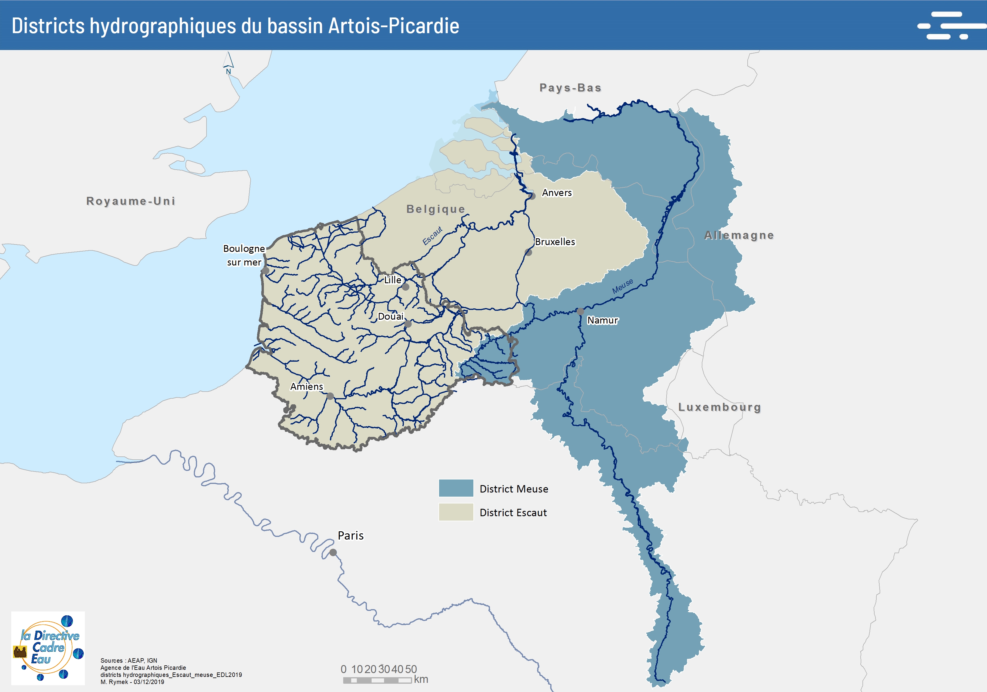 Cette carte issue de "l’état des lieux 2019" présente les 2 districts hydrographiques internationaux situés sur le bassin Artois-Picardie.