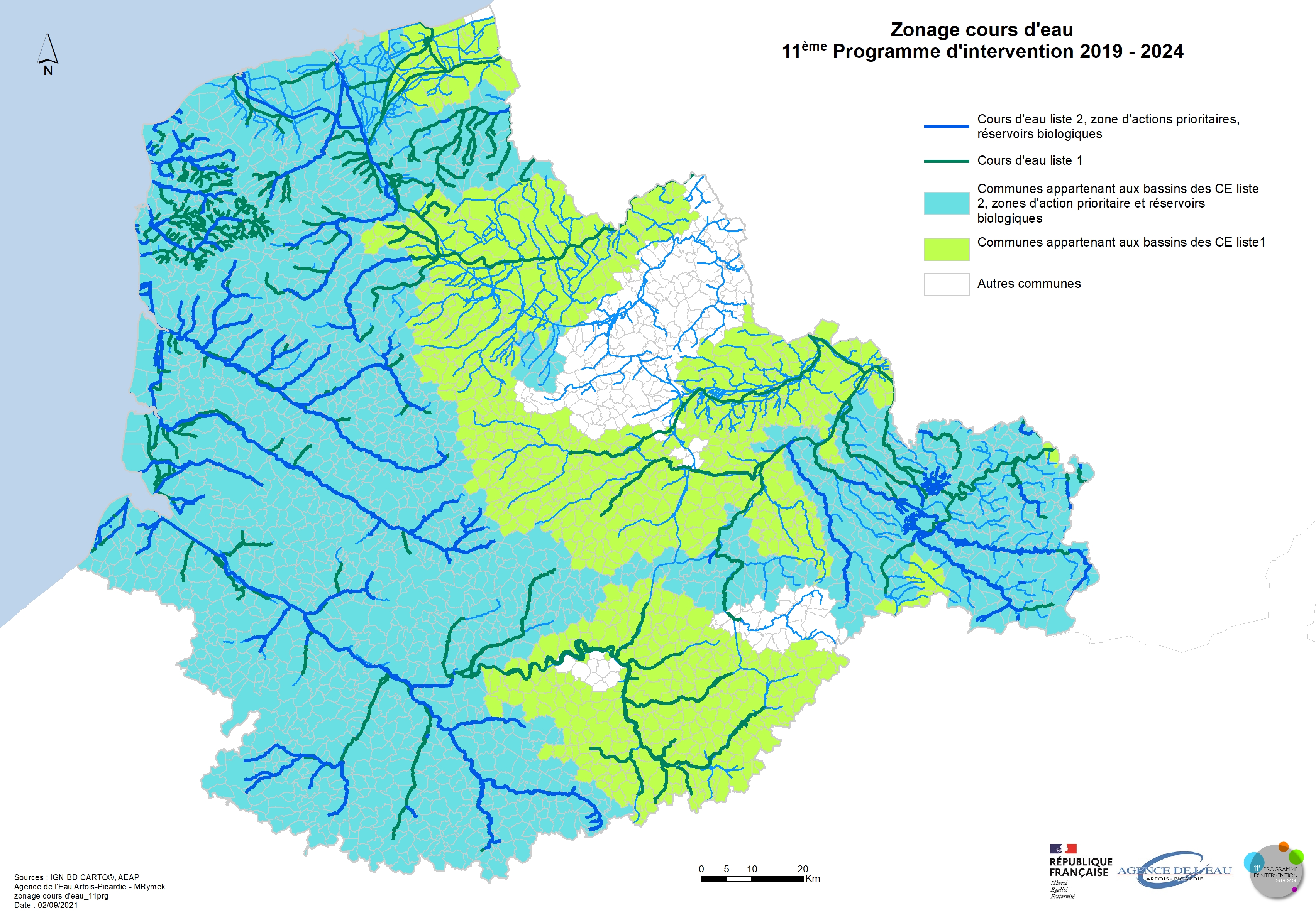 Différents zonages ont été définis pour orienter la mise en œuvre des politiques d’intervention de l’Agence au cours de la période 2019-2024. Cette carte représente le zonage identifiant les cours d'eau aux enjeux écologiques les plus forts du bassin Artois-Picardie.