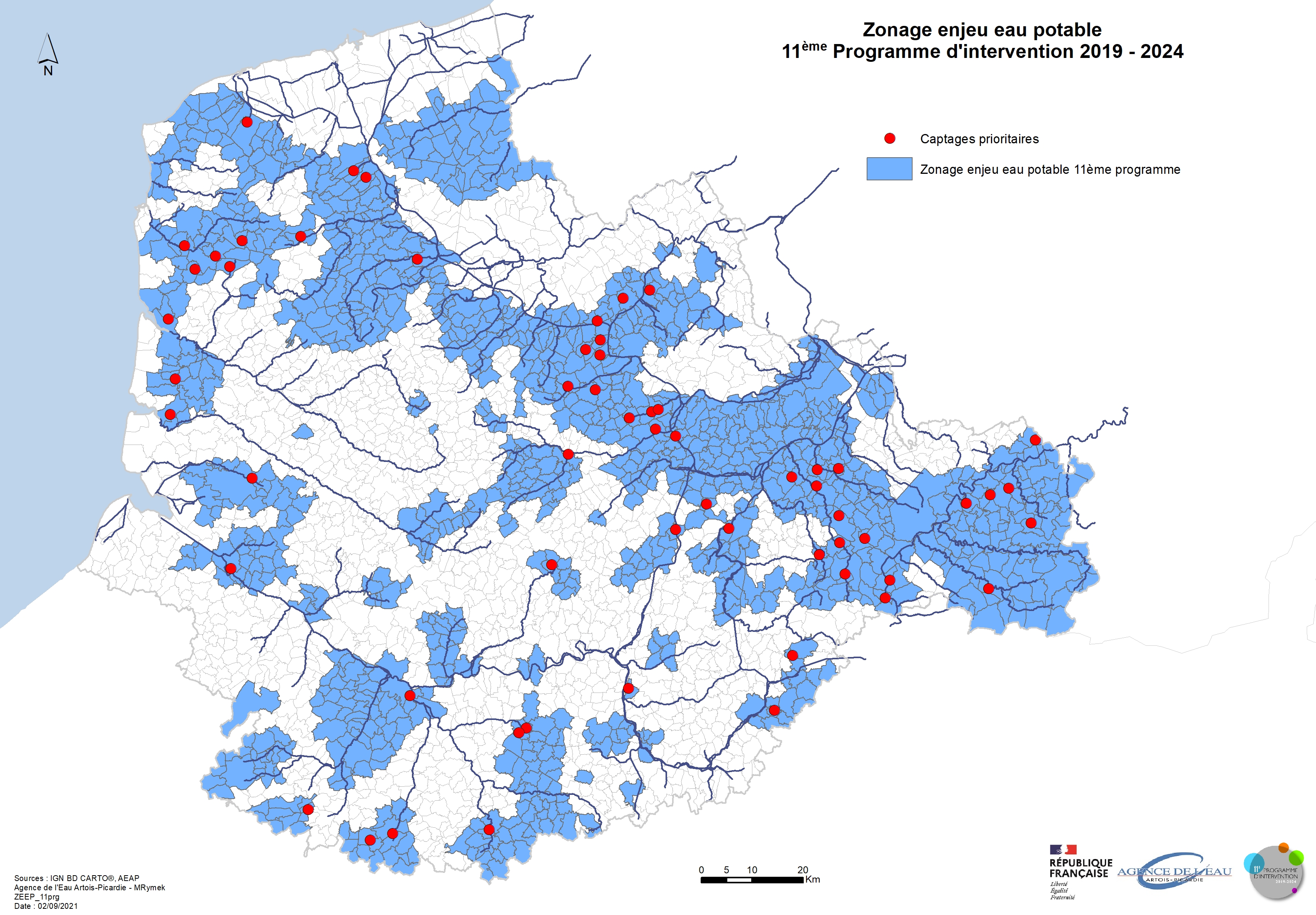 Différents zonages ont été définis pour orienter la mise en œuvre des politiques d’intervention de l’Agence au cours de la période 2019-2024. Cette carte représente le zonage enjeu eau potable