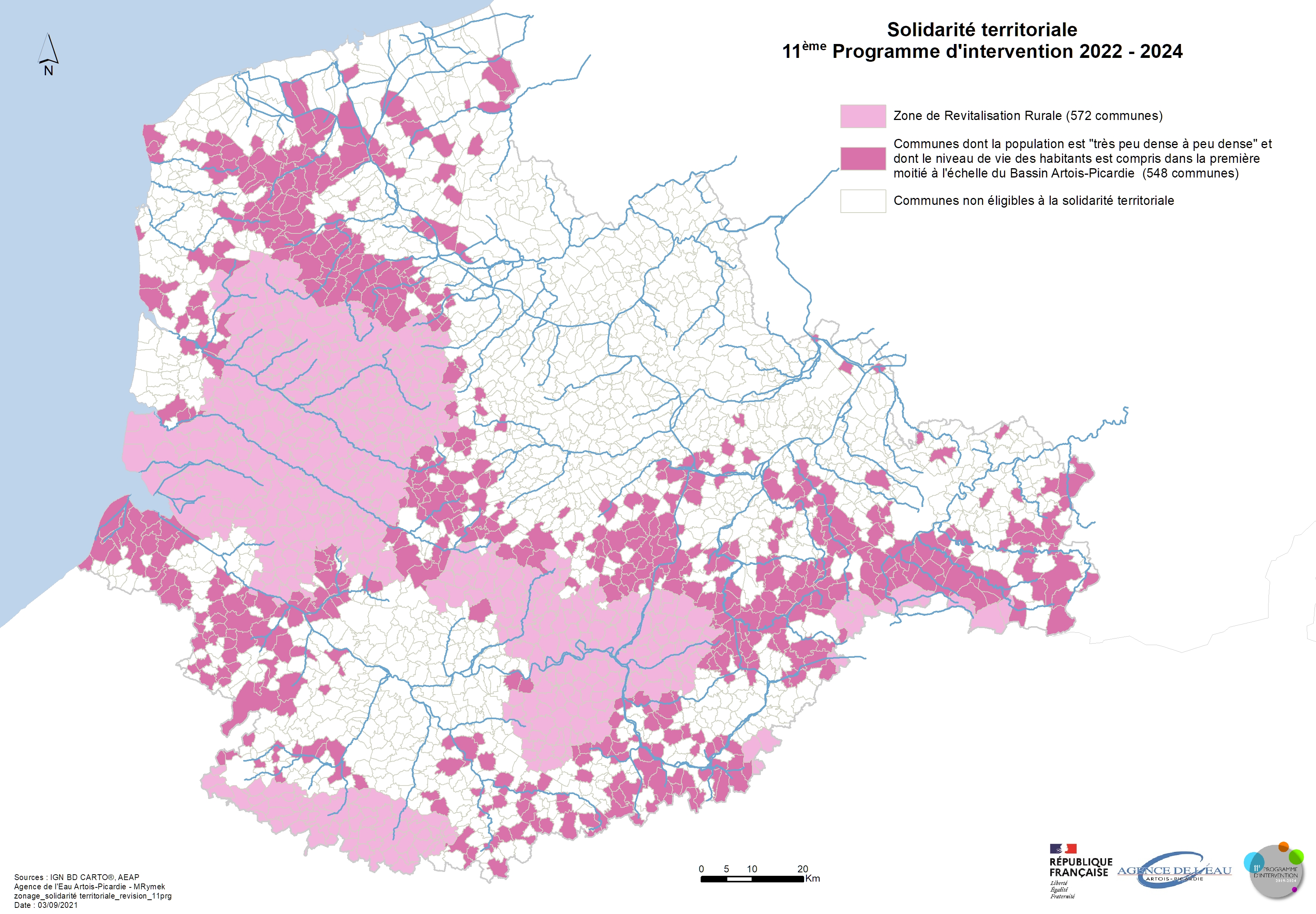 Différents zonages ont été définis pour orienter la mise en œuvre des politiques d’intervention de l’Agence au cours de la période 2019-2024. Cette carte représente les communes éligibles aux aides supplémentaires de 15% au titre de la solidarité territoriale.