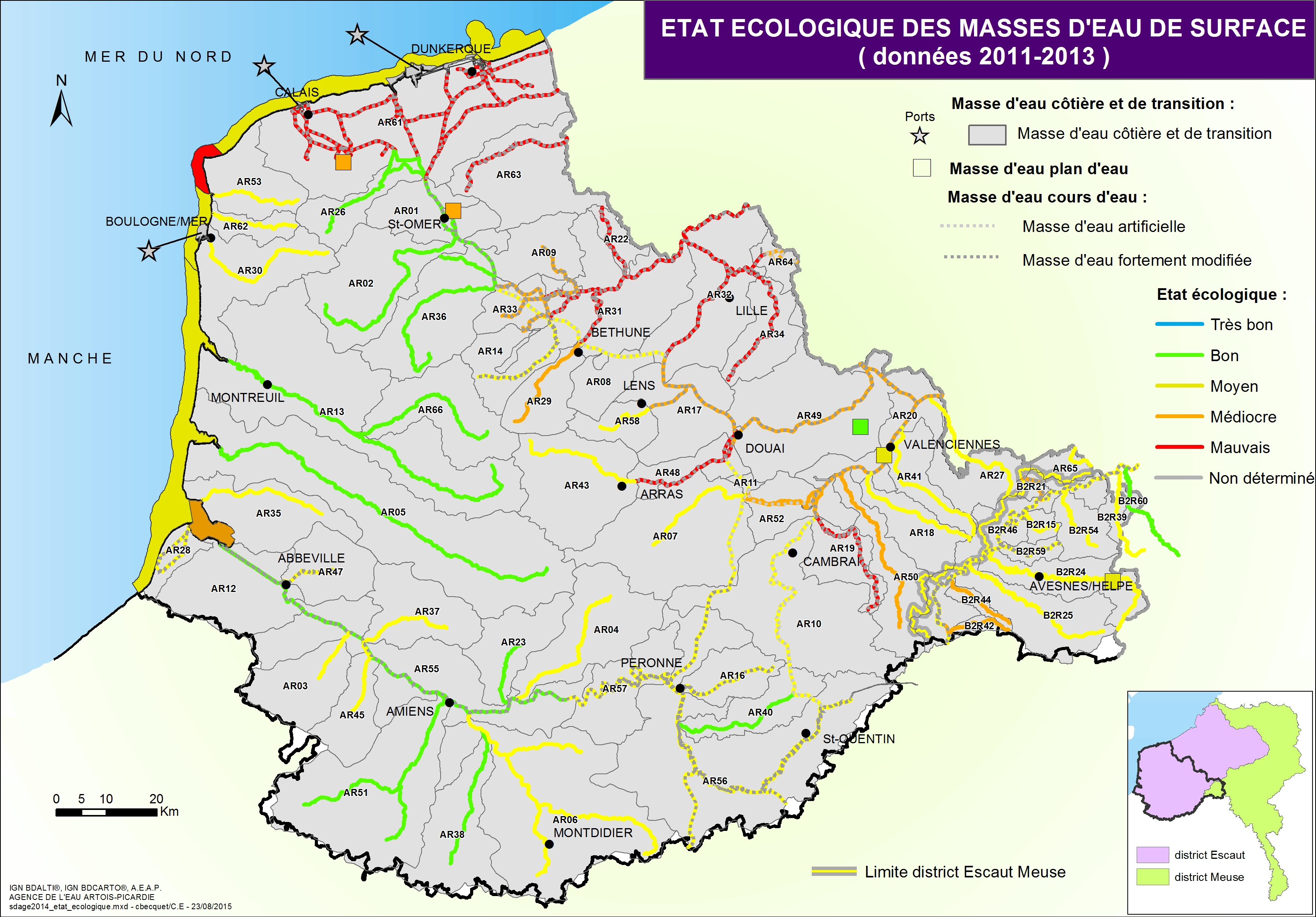 Le Schéma Directeur d'Aménagement et de Gestion des Eaux (SDAGE) fixe les objectifs d'atteinte du bon état des milieux aquatiques et les orientations pour atteindre ces objectifs. Cette carte issue du SDAGE 2016-2021 présente l'état écologique des masses d'eau de surface.
