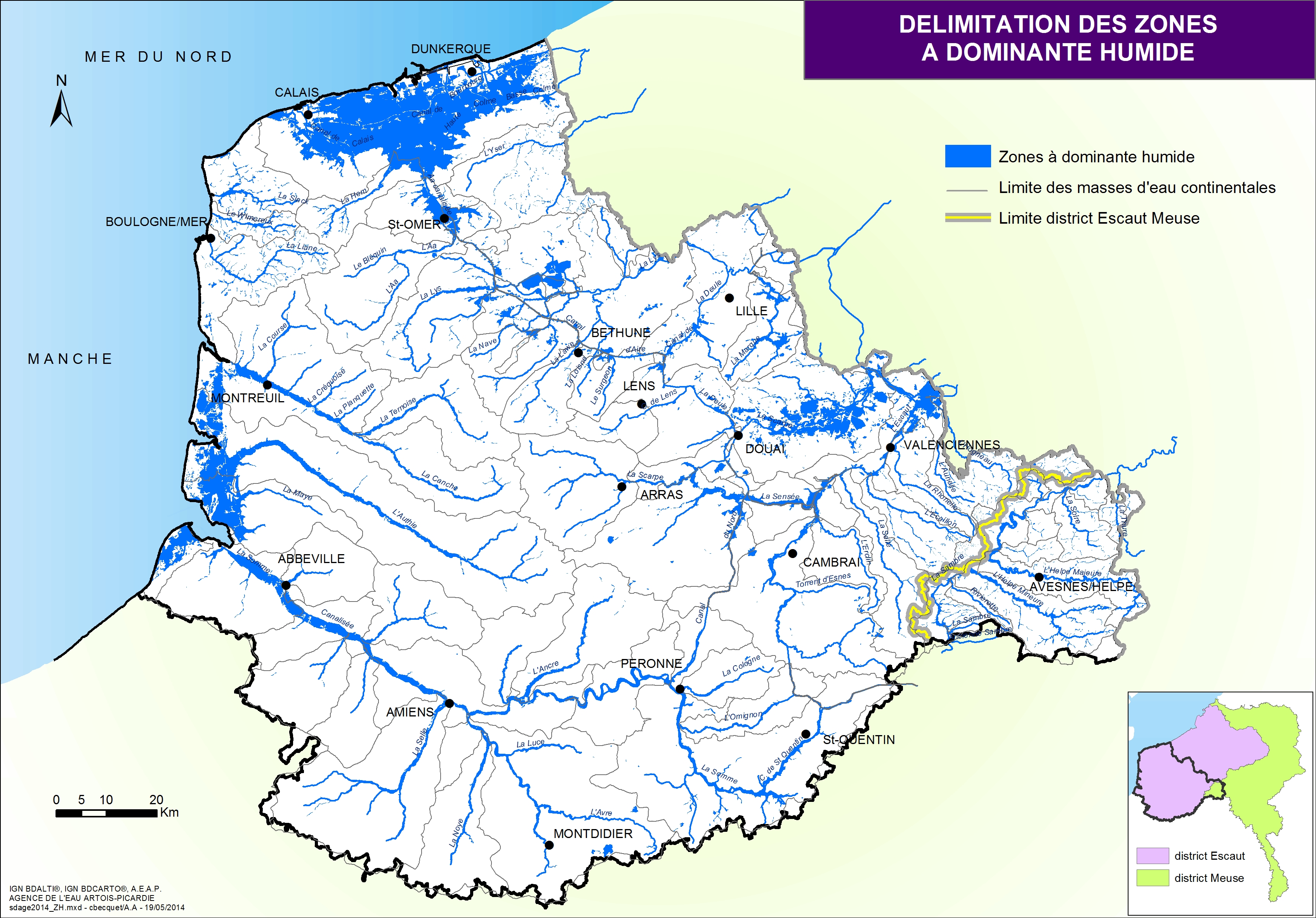 Le Schéma Directeur d'Aménagement et de Gestion des Eaux (SDAGE) fixe les objectifs d'atteinte du bon état des milieux aquatiques et les orientations pour atteindre ces objectifs. Cette carte issue du SDAGE 2016-2021 présente les zones à dominante humide, résultat d'une étude établie à partir de photographies aériennes et de contrôles de terrain, au 1/50 000e. Cette cartographie n’est pas une délimitation au sens de la loi.