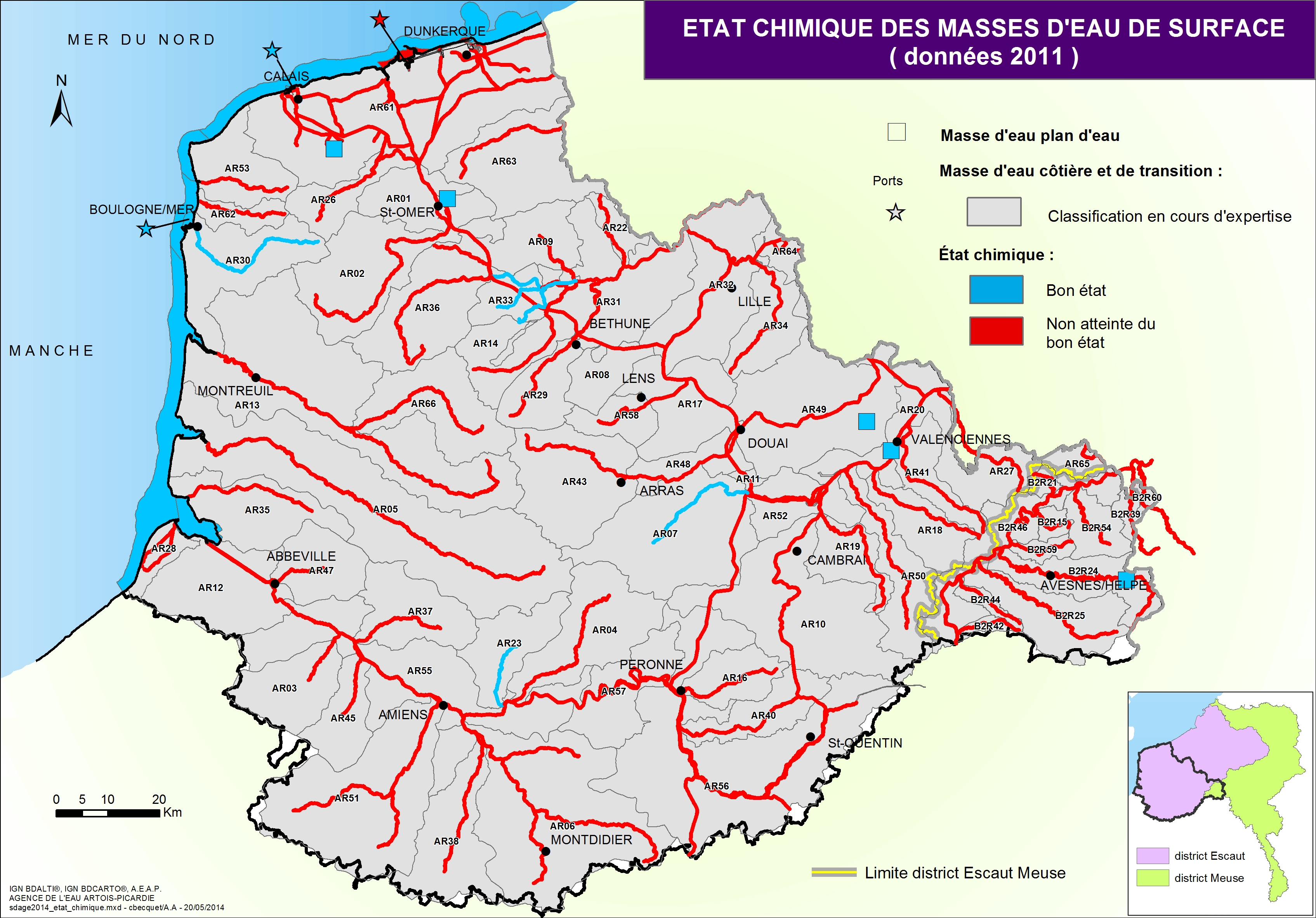 Le Schéma Directeur d'Aménagement et de Gestion des Eaux (SDAGE) fixe les objectifs d'atteinte du bon état des milieux aquatiques et les orientations pour atteindre ces objectifs. Cette carte issue du SDAGE 2016-2021 présente l'état chimique des masses d'eau de surface. L'état chimique est calculé à partir de la concentration en substances chimiques. Il comporte 2 états : bon et mauvais.
