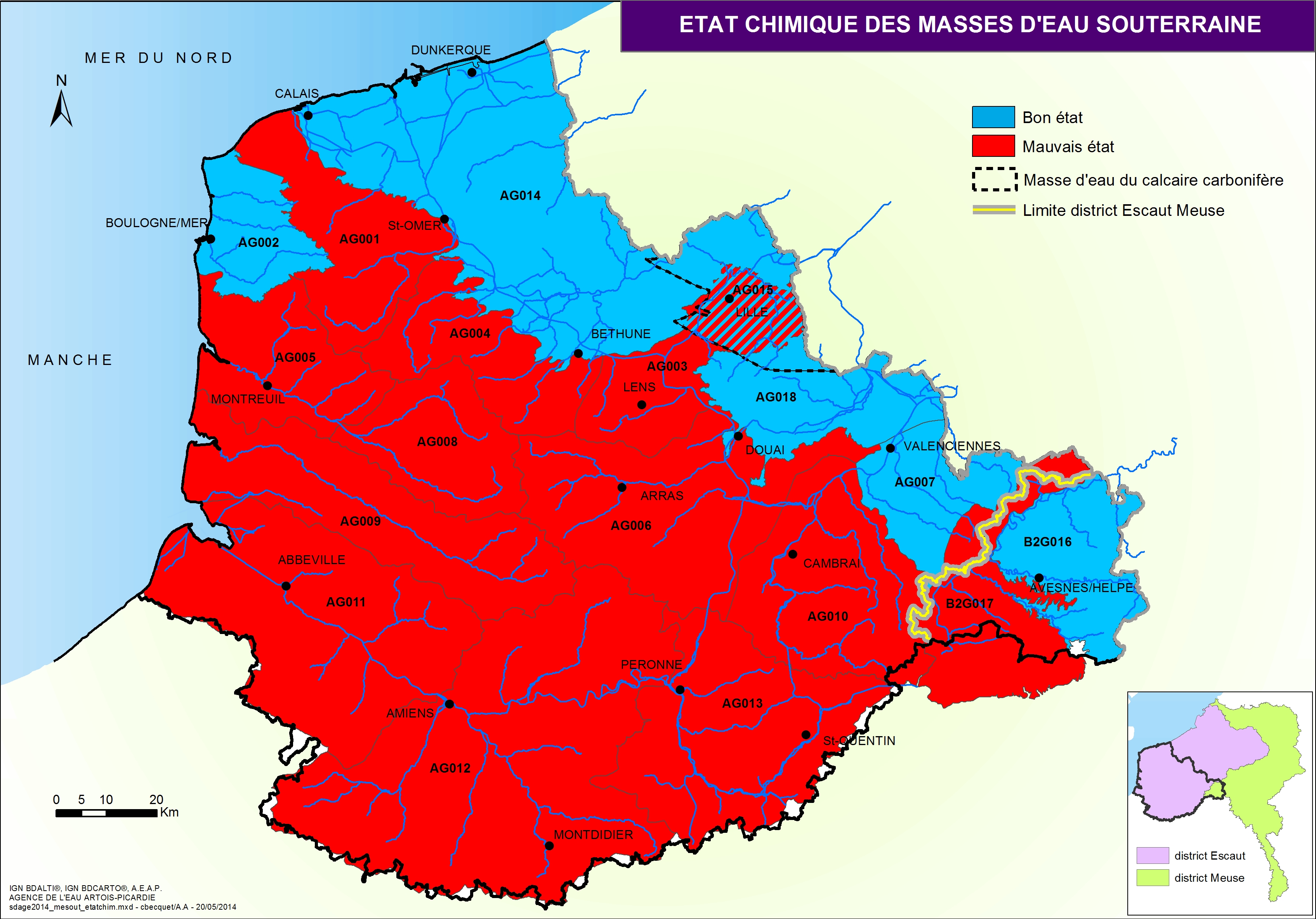 Le Schéma Directeur d'Aménagement et de Gestion des Eaux (SDAGE) fixe les objectifs d'atteinte du bon état des milieux aquatiques et les orientations pour atteindre ces objectifs. Cette carte issue du SDAGE 2016-2021 présente l'état chimique des masses d'eau de surface. L'état chimique est calculé à partir de la concentration en substances chimiques. Il comporte 2 états : bon et mauvais.