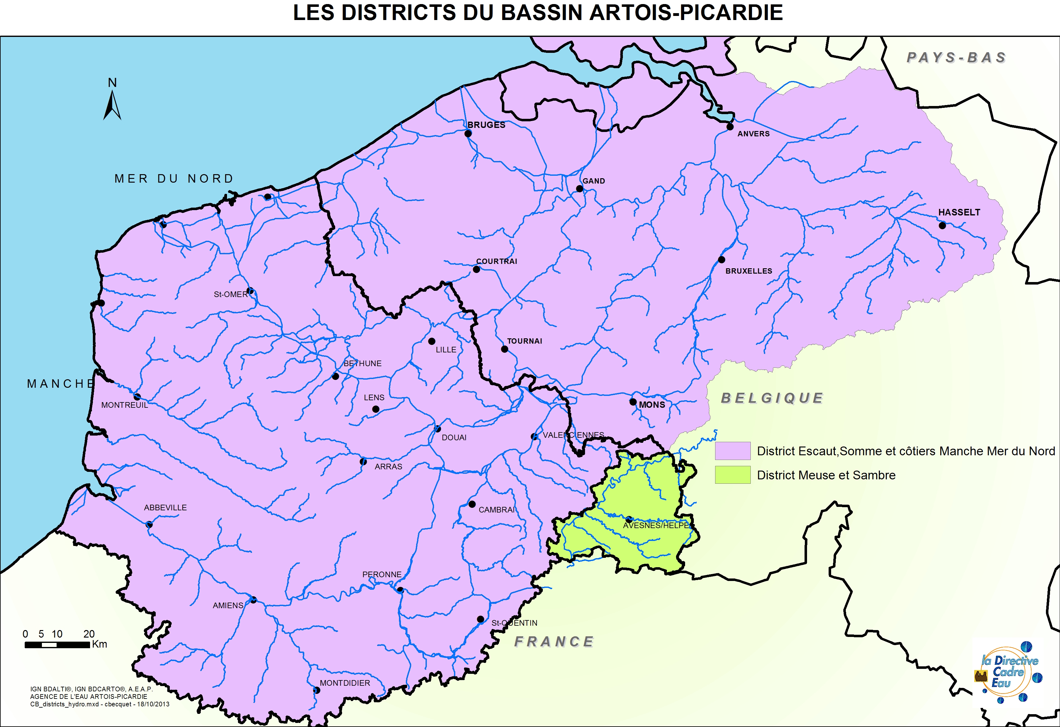 La Directive cadre sur l'eau définit de grands districts hydrographiques transfrontaliers. Le bassin Artois-Picardie est situé sur deux de ces districts : le district Escaut, Somme et côtiers Manche Mer du Nord et le district Meuse et Sambre. Ces deux districts transfrontaliers s'étendent sur la France, la Belgique et les Pays-Bas et font l'objet d'actions concertées et coordonnées entre pays.